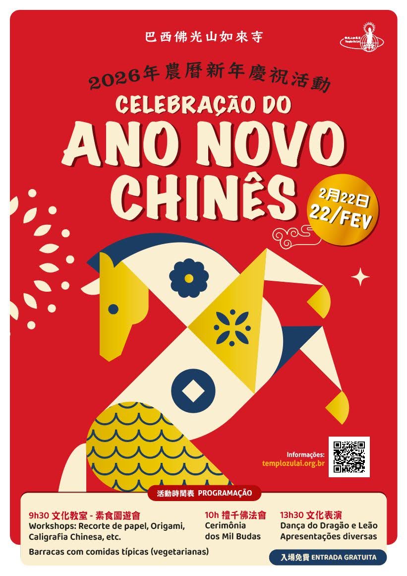 A Celebração do Ano Novo Chinês 2026 no Templo Zu Lai é um evento cultural aberto ao público que reúne tradição, espiritualidade e arte. A programação inclui cerimônia religiosa, danças típicas do Dragão e do Leão, apresentações culturais, workshops interativos e barracas com comidas vegetarianas tradicionais, proporcionando uma experiência única de celebração, cultura e boas energias para o novo ano.