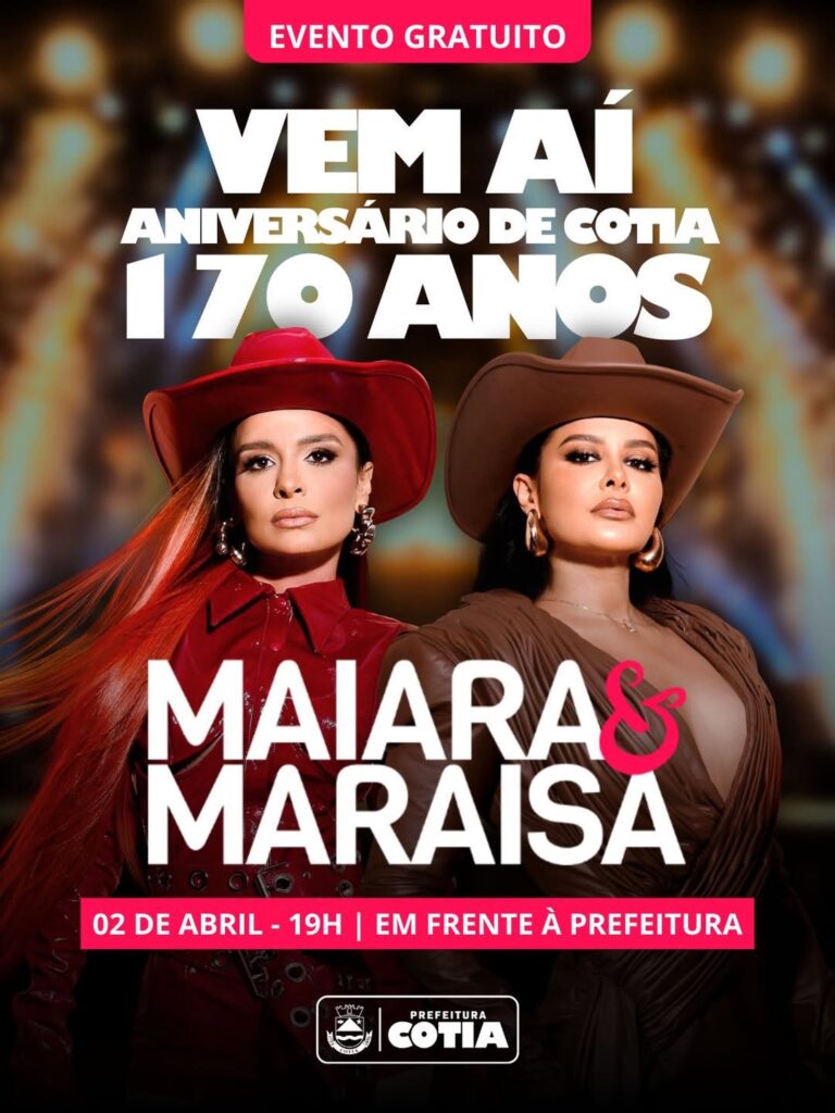 Em comemoração aos 170 anos de emancipação de Cotia, a cidade prepara uma grande celebração para moradores e visitantes, com destaque para o show da consagrada dupla sertaneja Maiara & Maraisa.